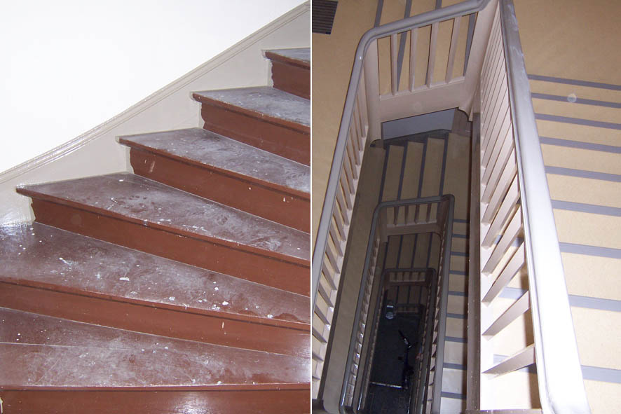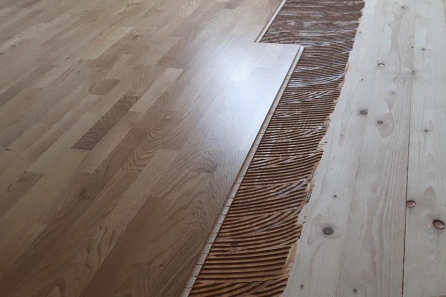 Treppenhaussanierung (Schleifen & Lackieren), Verlegen von Zweischichtfertigparkett |